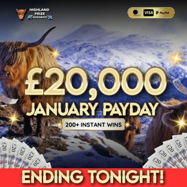 This competition is open to UK residents aged 18 or over. You may enter this competition up to 2500 times. You will be randomly allocated ticket number(s) when ordering and will receive an email confirmation. The total amount of tickets for this competition is (28500). If all tickets do not sell out, the draw will happen on January 31, 2025 regardless. You must answer the competition question correctly to be entered into the live draw. Incorrect entries will not be notified or entered into the live draw. You may enter the competition online, or for free by post by sending your entry to Highland Prize Giveaways on a postcard. You must have an account on Highland Prize Giveaways for your entry to be processed. All details on your entry MUST correspond to the details on your account to receive the order confirmation and ticket number. Postal entries received without a registered account cannot be processed. The live draw will take place on Highland Prize Giveaways’s Facebook page using Google’s random number generator to select the winning ticket number from all Entrants. This competition is in no way sponsored, endorsed, administered by or associated with Facebook, Apple or Google. By entering the competition, Entrants agree that neither Facebook, Apple nor Google have any liability and are not responsible for the administration or promotion of this competition.