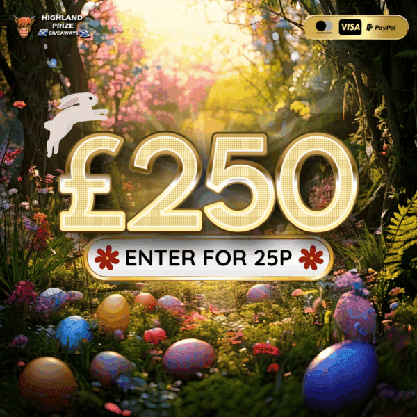 This competition is open to UK residents aged 18 or over. You may enter this competition up to 150 times. You will be randomly allocated ticket number(s) when ordering and will receive an email confirmation. The total amount of tickets for this competition is (1500). If all tickets do not sell out, the draw will happen on April 12, 2025 regardless. You must answer the competition question correctly to be entered into the live draw. Incorrect entries will not be notified or entered into the live draw. You may enter the competition online, or for free by post by sending your entry to Highland Prize Giveaways on a postcard. You must have an account on Highland Prize Giveaways for your entry to be processed. All details on your entry MUST correspond to the details on your account to receive the order confirmation and ticket number. Postal entries received without a registered account cannot be processed. The live draw will take place on Highland Prize Giveaways’s Facebook page using Google’s random number generator to select the winning ticket number from all Entrants. This competition is in no way sponsored, endorsed, administered by or associated with Facebook, Apple or Google. By entering the competition, Entrants agree that neither Facebook, Apple nor Google have any liability and are not responsible for the administration or promotion of this competition.