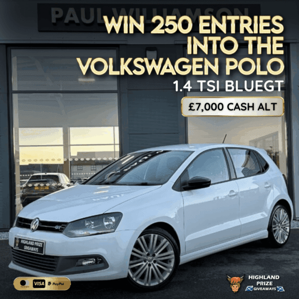 This competition is open to UK residents aged 18 or over. You may enter this competition up to 30 times. You will be randomly allocated ticket number(s) when ordering and will receive an email confirmation. The total amount of tickets for this competition is (300). If all tickets do not sell out, the draw will happen on December 31, 2024 regardless. You must answer the competition question correctly to be entered into the live draw. Incorrect entries will not be notified or entered into the live draw. You may enter the competition online, or for free by post by sending your entry to Highland Prize Giveaways on a postcard. You must have an account on Highland Prize Giveaways for your entry to be processed. All details on your entry MUST correspond to the details on your account to receive the order confirmation and ticket number. Postal entries received without a registered account cannot be processed. The live draw will take place on Highland Prize Giveaways’s Facebook page using Google’s random number generator to select the winning ticket number from all Entrants. This competition is in no way sponsored, endorsed, administered by or associated with Facebook, Apple or Google. By entering the competition, Entrants agree that neither Facebook, Apple nor Google have any liability and are not responsible for the administration or promotion of this competition.