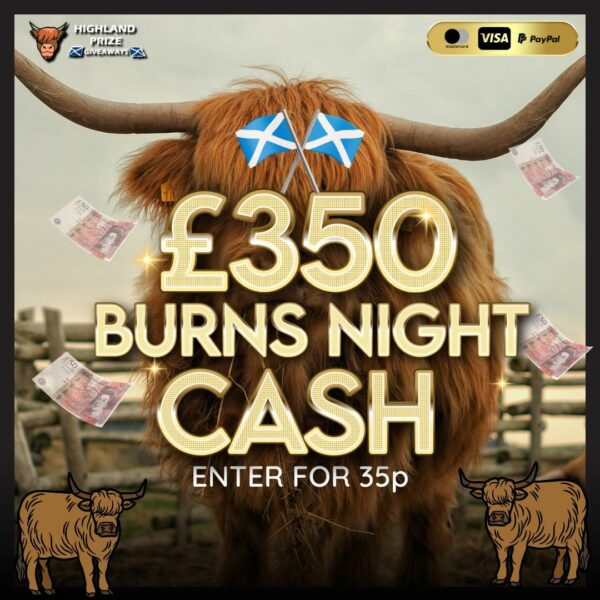 This competition is open to UK residents aged 18 or over. You may enter this competition up to 150 times. You will be randomly allocated ticket number(s) when ordering and will receive an email confirmation. The total amount of tickets for this competition is (1500). If all tickets do not sell out, the draw will happen on January 21, 2025 regardless. You must answer the competition question correctly to be entered into the live draw. Incorrect entries will not be notified or entered into the live draw. You may enter the competition online, or for free by post by sending your entry to Highland Prize Giveaways on a postcard. You must have an account on Highland Prize Giveaways for your entry to be processed. All details on your entry MUST correspond to the details on your account to receive the order confirmation and ticket number. Postal entries received without a registered account cannot be processed. The live draw will take place on Highland Prize Giveaways’s Facebook page using Google’s random number generator to select the winning ticket number from all Entrants. This competition is in no way sponsored, endorsed, administered by or associated with Facebook, Apple or Google. By entering the competition, Entrants agree that neither Facebook, Apple nor Google have any liability and are not responsible for the administration or promotion of this competition.