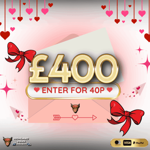 This competition is open to UK residents aged 18 or over. You may enter this competition up to 150 times. You will be randomly allocated ticket number(s) when ordering and will receive an email confirmation. The total amount of tickets for this competition is (1500). If all tickets do not sell out, the draw will happen on February 13, 2025 regardless. You must answer the competition question correctly to be entered into the live draw. Incorrect entries will not be notified or entered into the live draw. You may enter the competition online, or for free by post by sending your entry to Highland Prize Giveaways on a postcard. You must have an account on Highland Prize Giveaways for your entry to be processed. All details on your entry MUST correspond to the details on your account to receive the order confirmation and ticket number. Postal entries received without a registered account cannot be processed. The live draw will take place on Highland Prize Giveaways’s Facebook page using Google’s random number generator to select the winning ticket number from all Entrants. This competition is in no way sponsored, endorsed, administered by or associated with Facebook, Apple or Google. By entering the competition, Entrants agree that neither Facebook, Apple nor Google have any liability and are not responsible for the administration or promotion of this competition.