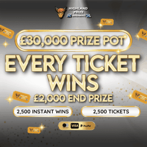 This competition is open to UK residents aged 18 or over. You may enter this competition up to 275 times. You will be randomly allocated ticket number(s) when ordering and will receive an email confirmation. The total amount of tickets for this competition is (2850). If all tickets do not sell out, the draw will happen on August 11, 2025 regardless. You must answer the competition question correctly to be entered into the live draw. Incorrect entries will not be notified or entered into the live draw. You may enter the competition online, or for free by post by sending your entry to Highland Prize Giveaways on a postcard. You must have an account on Highland Prize Giveaways for your entry to be processed. All details on your entry MUST correspond to the details on your account to receive the order confirmation and ticket number. Postal entries received without a registered account cannot be processed. The live draw will take place on Highland Prize Giveaways’s Facebook page using Google’s random number generator to select the winning ticket number from all Entrants. This competition is in no way sponsored, endorsed, administered by or associated with Facebook, Apple or Google. By entering the competition, Entrants agree that neither Facebook, Apple nor Google have any liability and are not responsible for the administration or promotion of this competition.