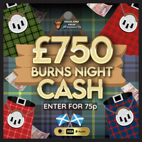 This competition is open to UK residents aged 18 or over. You may enter this competition up to 150 times. You will be randomly allocated ticket number(s) when ordering and will receive an email confirmation. The total amount of tickets for this competition is (1500). If all tickets do not sell out, the draw will happen on January 26, 2025 regardless. You must answer the competition question correctly to be entered into the live draw. Incorrect entries will not be notified or entered into the live draw. You may enter the competition online, or for free by post by sending your entry to Highland Prize Giveaways on a postcard. You must have an account on Highland Prize Giveaways for your entry to be processed. All details on your entry MUST correspond to the details on your account to receive the order confirmation and ticket number. Postal entries received without a registered account cannot be processed. The live draw will take place on Highland Prize Giveaways’s Facebook page using Google’s random number generator to select the winning ticket number from all Entrants. This competition is in no way sponsored, endorsed, administered by or associated with Facebook, Apple or Google. By entering the competition, Entrants agree that neither Facebook, Apple nor Google have any liability and are not responsible for the administration or promotion of this competition.