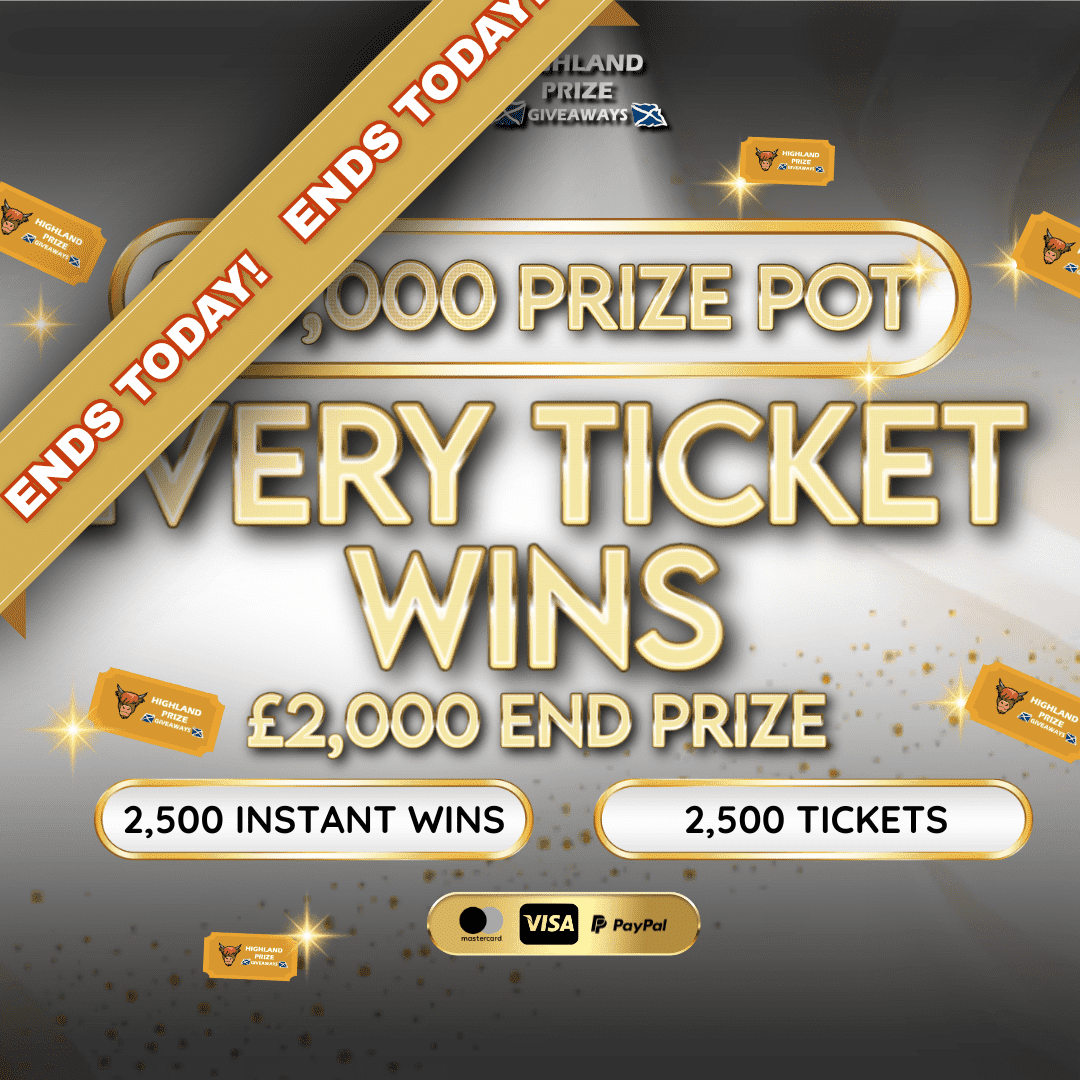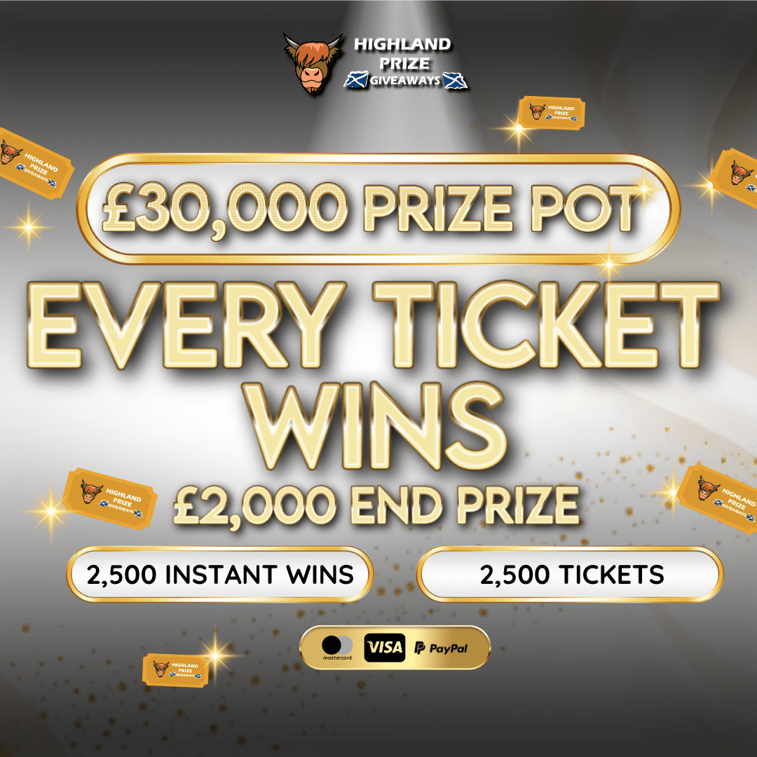 This competition is open to UK residents aged 18 or over. You may enter this competition up to 125 times. You will be randomly allocated ticket number(s) when ordering and will receive an email confirmation. The total amount of tickets for this competition is (2500). If all tickets do not sell out, the draw will happen on November 21, 2025 regardless. You must answer the competition question correctly to be entered into the live draw. Incorrect entries will not be notified or entered into the live draw. You may enter the competition online, or for free by post by sending your entry to Highland Prize Giveaways on a postcard. You must have an account on Highland Prize Giveaways for your entry to be processed. All details on your entry MUST correspond to the details on your account to receive the order confirmation and ticket number. Postal entries received without a registered account cannot be processed. The live draw will take place on Highland Prize Giveaways’s Facebook page using Google’s random number generator to select the winning ticket number from all Entrants. This competition is in no way sponsored, endorsed, administered by or associated with Facebook, Apple or Google. By entering the competition, Entrants agree that neither Facebook, Apple nor Google have any liability and are not responsible for the administration or promotion of this competition.