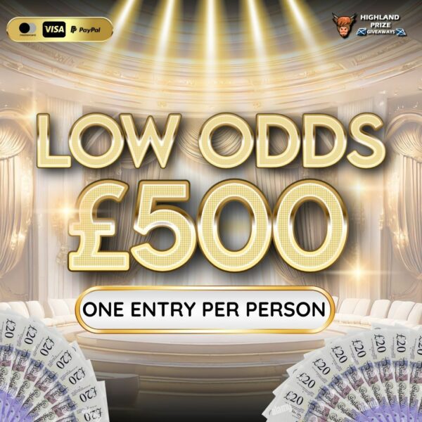 This competition is open to UK residents aged 18 or over. You may enter this competition up to 1 times. You will be randomly allocated ticket number(s) when ordering and will receive an email confirmation. The total amount of tickets for this competition is (60). If all tickets do not sell out, the draw will happen on November 10, 2025 regardless. You must answer the competition question correctly to be entered into the live draw. Incorrect entries will not be notified or entered into the live draw. You may enter the competition online, or for free by post by sending your entry to Highland Prize Giveaways on a postcard. You must have an account on Highland Prize Giveaways for your entry to be processed. All details on your entry MUST correspond to the details on your account to receive the order confirmation and ticket number. Postal entries received without a registered account cannot be processed. The live draw will take place on Highland Prize Giveaways’s Facebook page using Google’s random number generator to select the winning ticket number from all Entrants. This competition is in no way sponsored, endorsed, administered by or associated with Facebook, Apple or Google. By entering the competition, Entrants agree that neither Facebook, Apple nor Google have any liability and are not responsible for the administration or promotion of this competition.